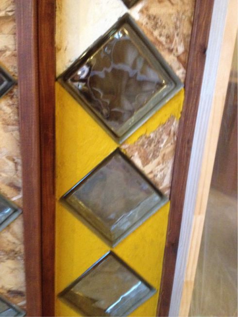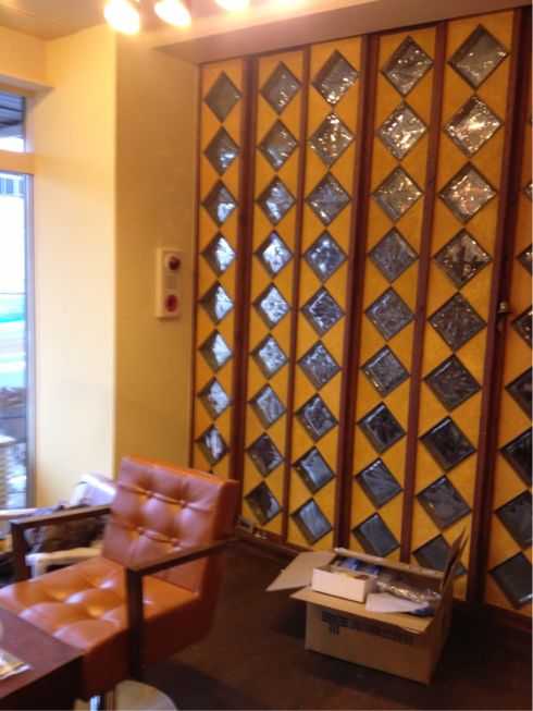 ガラスブロックの壁の鮮やかな黄色は壁剤にターメリックを混合したもの。