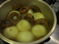 放射に切り目を入れたたまねぎを一枚一枚蓮の花びらに見立て開いてゆく。