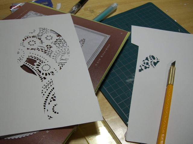 ですので きり絵にしろ、木枠作りにしろ 手探りで作業を進めていきます。限られた時間のなか働く以外の時間と乏しい頭脳をもうほとんどこれに費やしたといってもいいほど 熱中させてもらいました。