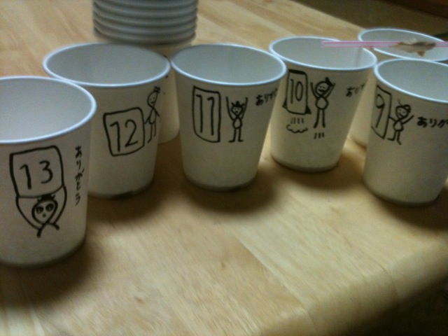紙コップに芯となる糸を張り、そこに色つきパラフィンを好き好きに重ね詰め込んでいく。