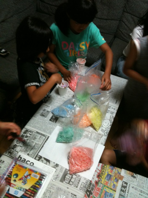 パラフィンワックスに好きな色のクレヨンを混ぜ合わせてつくる者もあり(^ ^)、